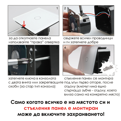 Стъклен панел за единичен сензорен ключ, комплект с монтажна метална основа 86*86mm-БЯЛ..